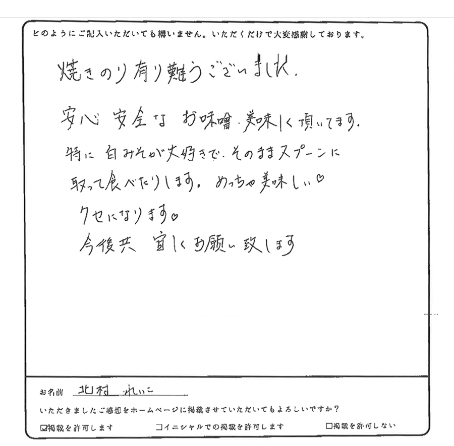 はじめてマルカワみそをいただいた時「こんなにおいしいみそはじめて‼」 と感動しました!さらに健康にもとても良いみそで感謝しかありません。
