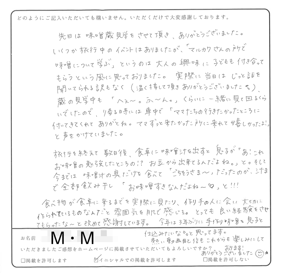 先日は、味噌蔵見学にお越しいただき誠にありがとうございました。お味噌について学ぶというのは、お子様としては興味を持ちにくいというのが正直なところだと思います。お子様が食卓で「お味噌の勉強したところの?!お豆から出来ているんだよね」「お味噌好きなんだよね」のお言葉は味噌蔵見学を案内した弊社としましては嬉しい言葉でございます。お味噌汁などに興味を持ち、好きになってくれると幸いです。