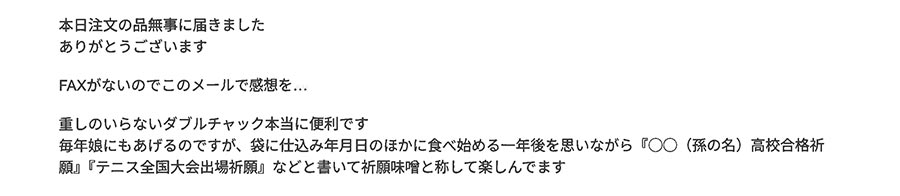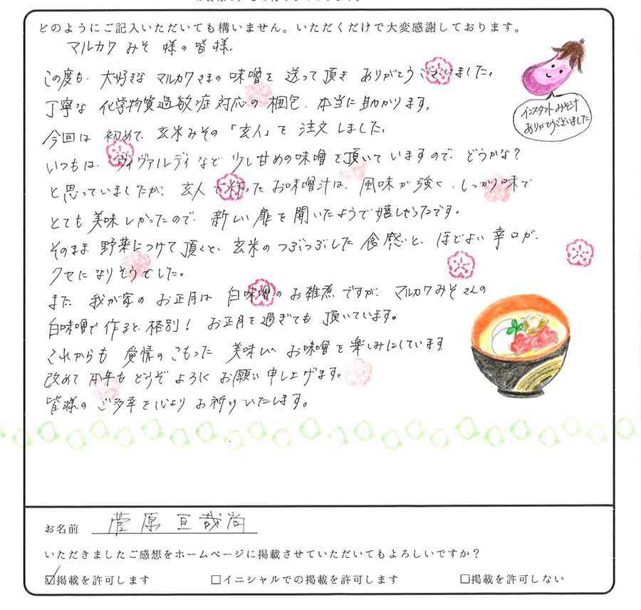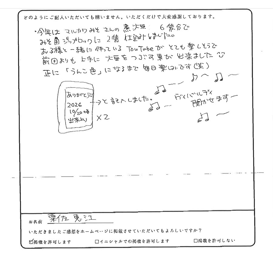 これからも愛情のこもった美味いお味噌を楽しみにしています。