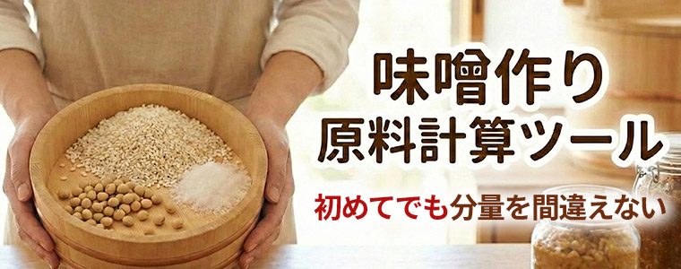 みその種類・量を選ぶだけで、麹・大豆・塩の必要量を自動計算します。