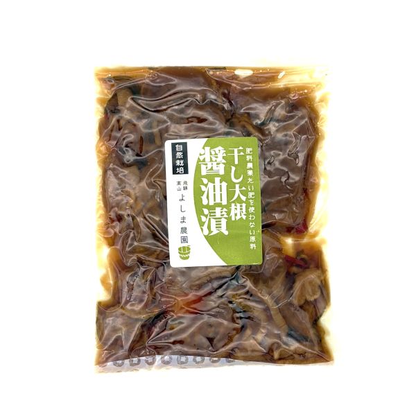 無農薬・無肥料の大根を天日干しにし、たっぷりのだし醤油で仕込みました。また、天日干しなので大根の味がしっかりしていて旨味がギュッと凝縮。