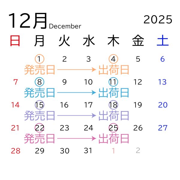 月曜日発売の場合でも、その週の火曜、水曜、木曜のいずれかに祝日があった場合、発送は金曜日になります。商品到着はご注文週の土曜、日曜、月曜のいずれかになります。