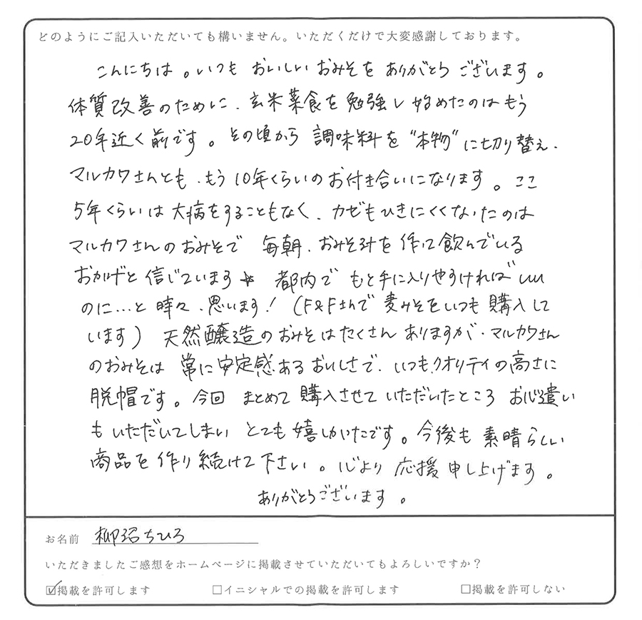 十年間もの長い間、弊社のおみそをお買い上げくださり感謝申し上げます。柳沼様は体質改善のために、玄米菜食を勉強なさったのですね。
